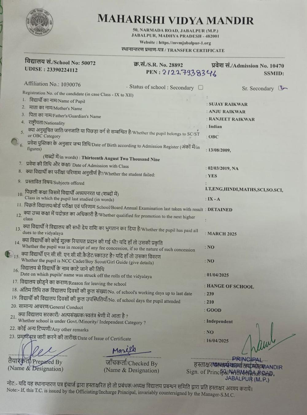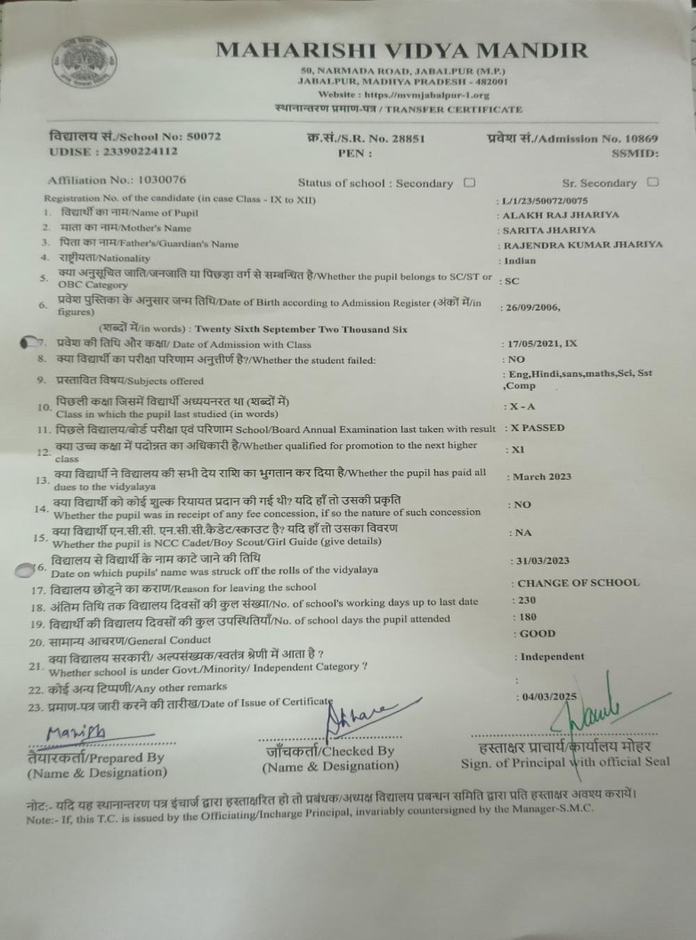| 3 | 10869 | ALAKH RAJ JHARIYA | X | A | |
