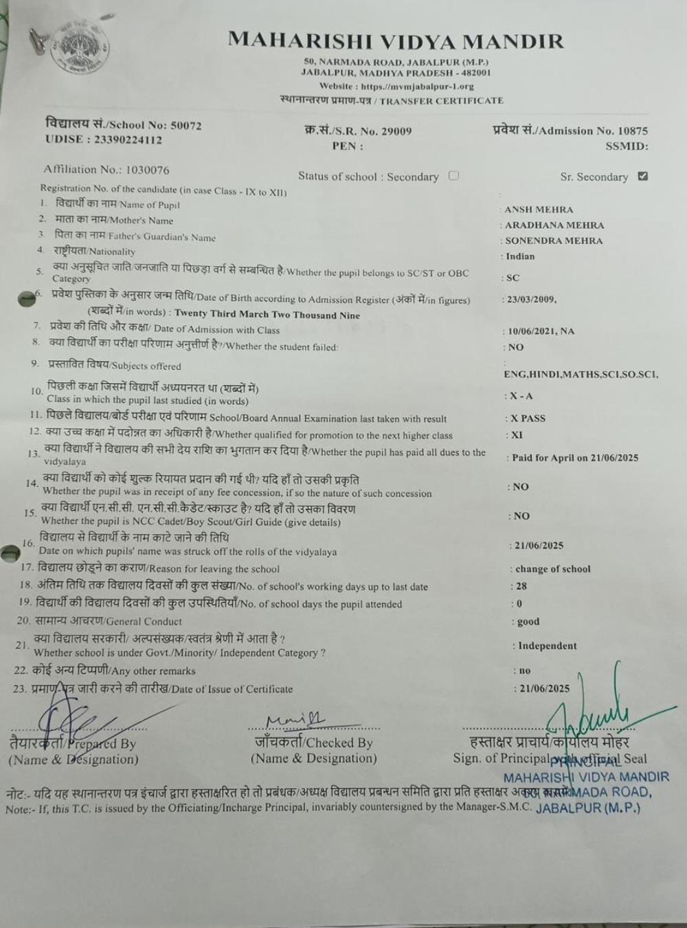 | 4 | 10875 | ANSH MEHRA | X | A | |