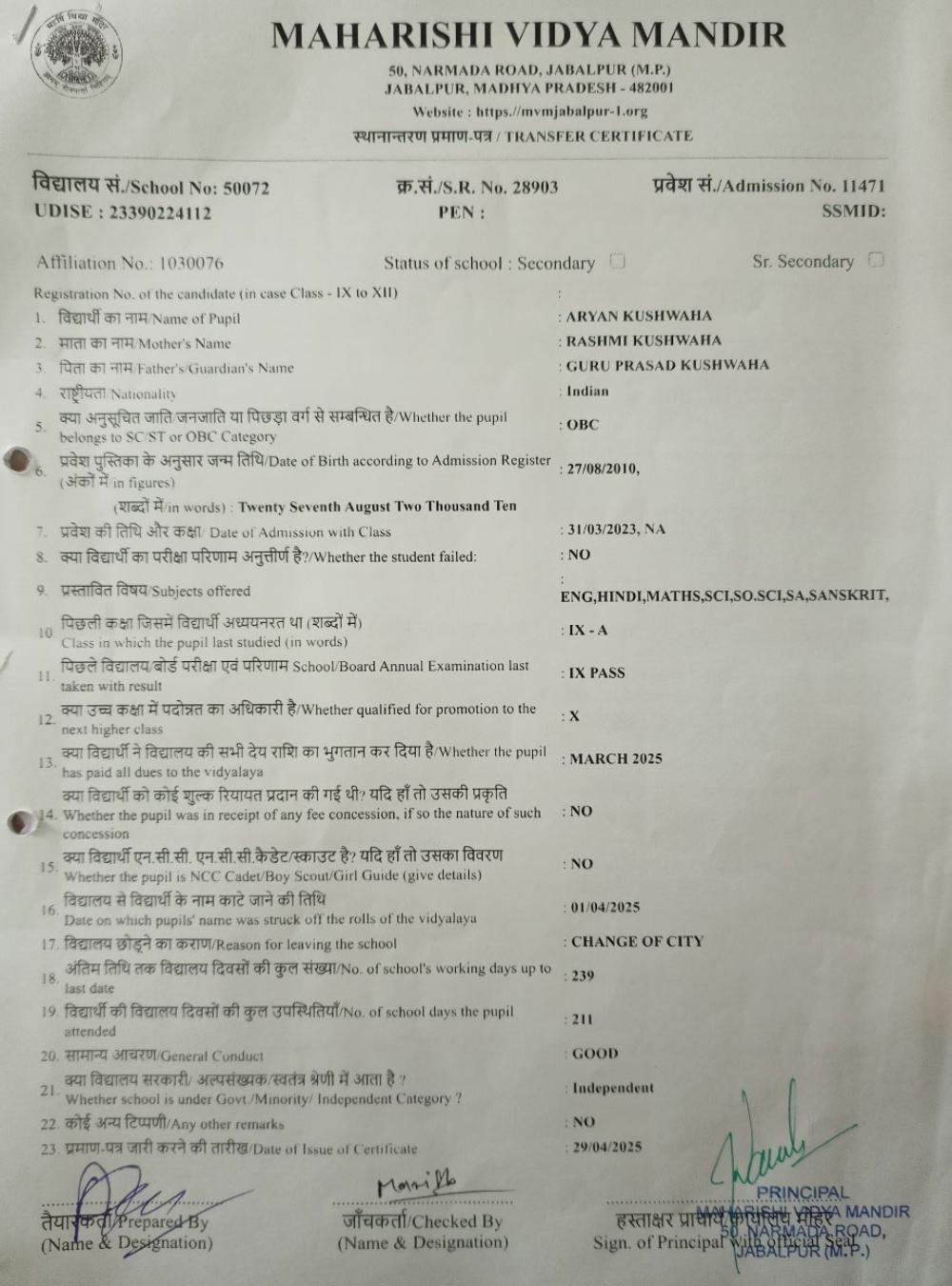 | 8 | 11471 | ARYAN KUSHWAHA | IX | A | |