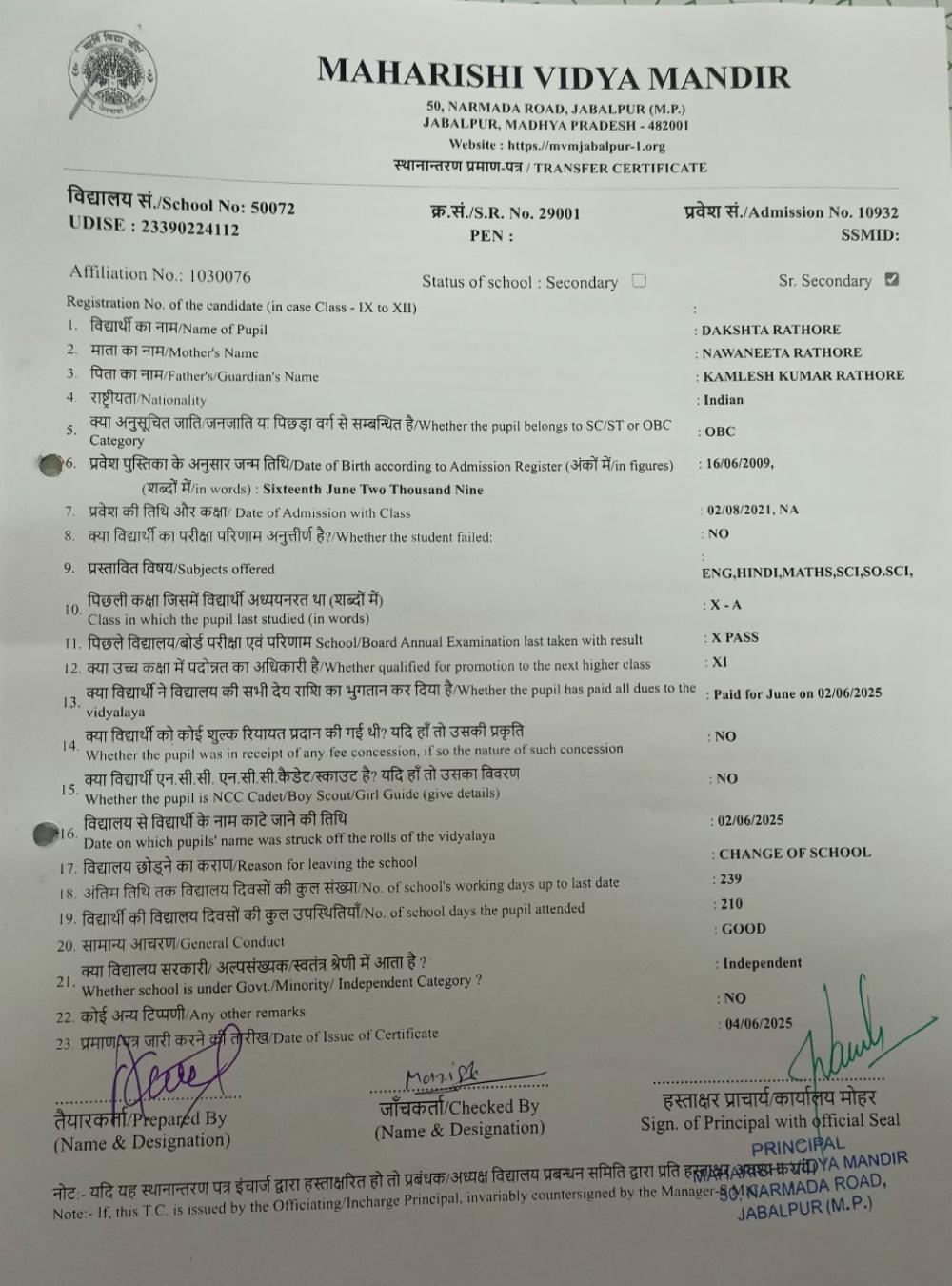 | 6 | 10932 | DAKSHTA RATHORE | X | A | |
