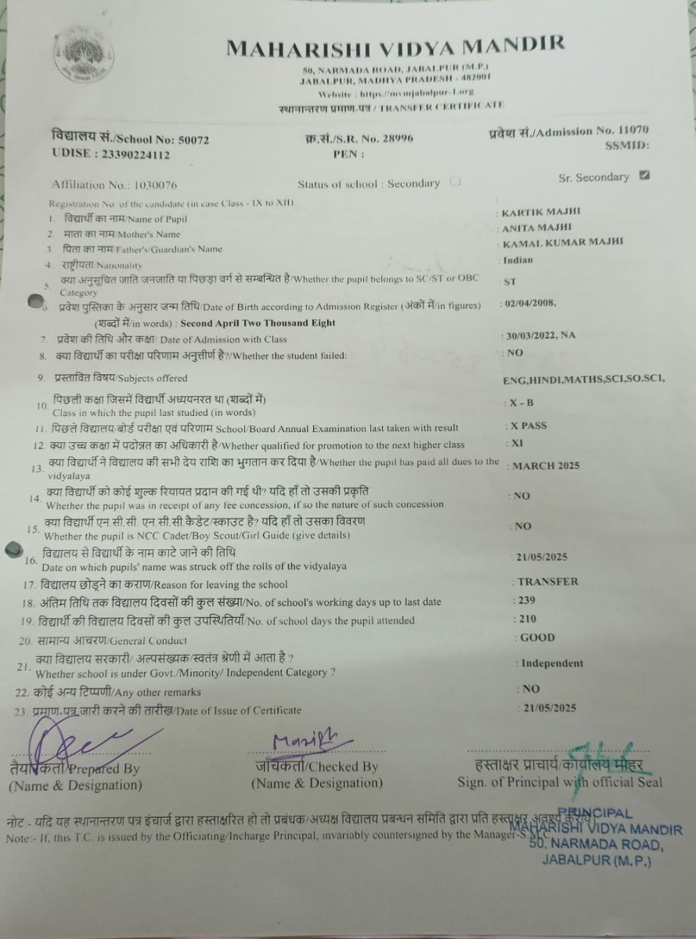 | 7 | 11070 | KARTIK MAJHI | X | B | |