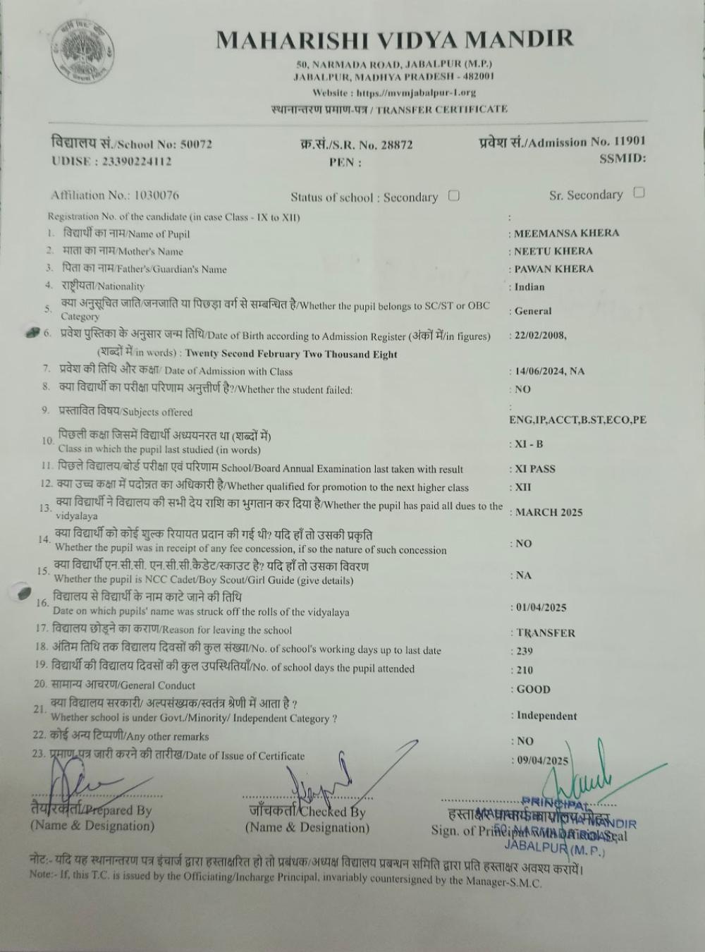 | 11 | 11901 | MEEMANSA KHERA | XI | B | |