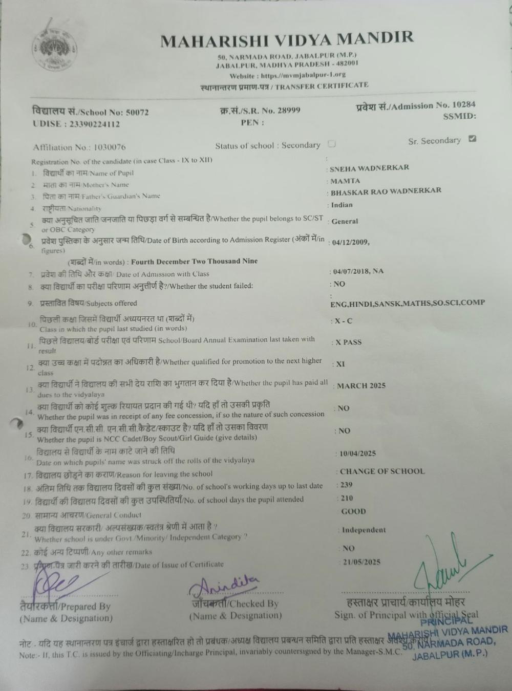| 1 | 10284 | SNEHA WADNERKAR | X | C | |