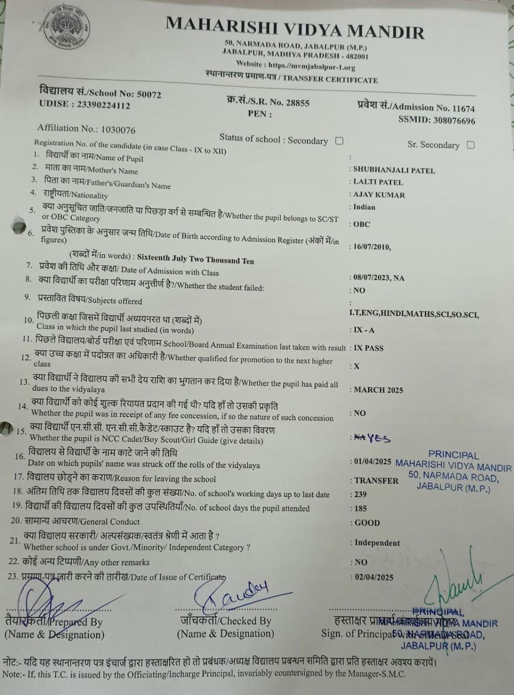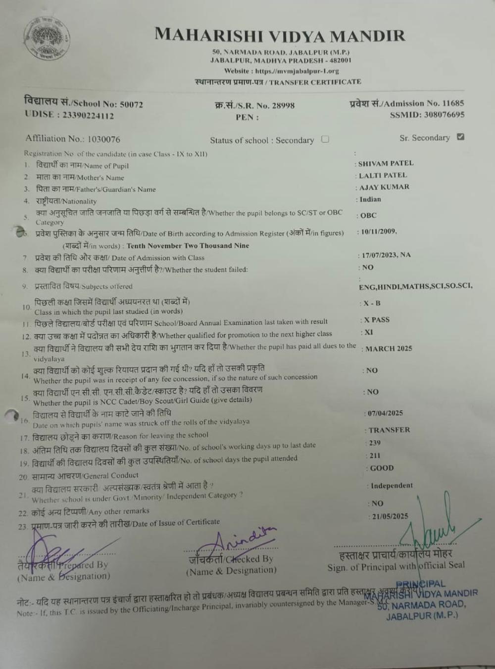 | 10 | 11685 | SHIVAM PATEL | X | B | |